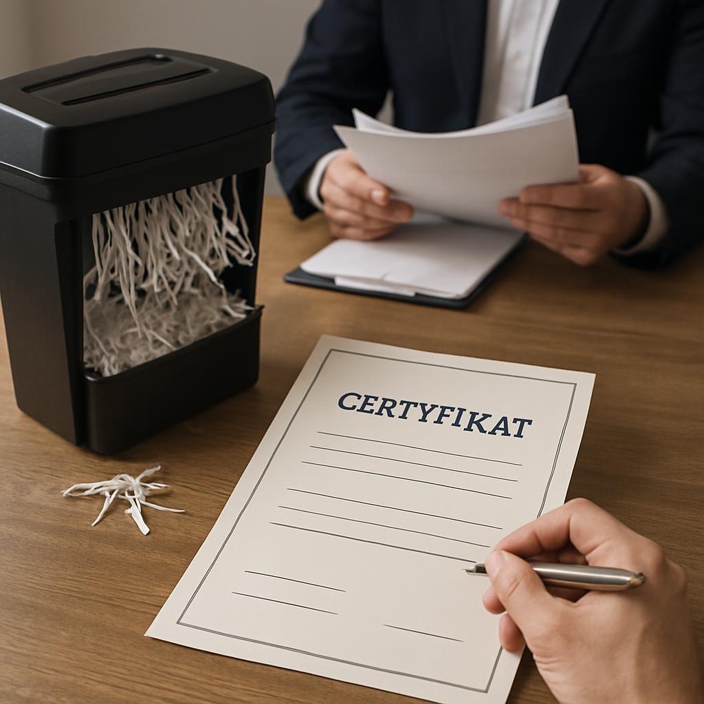 - Certyfikat potwierdzający prawidłowe zniszczenie dokumentów.